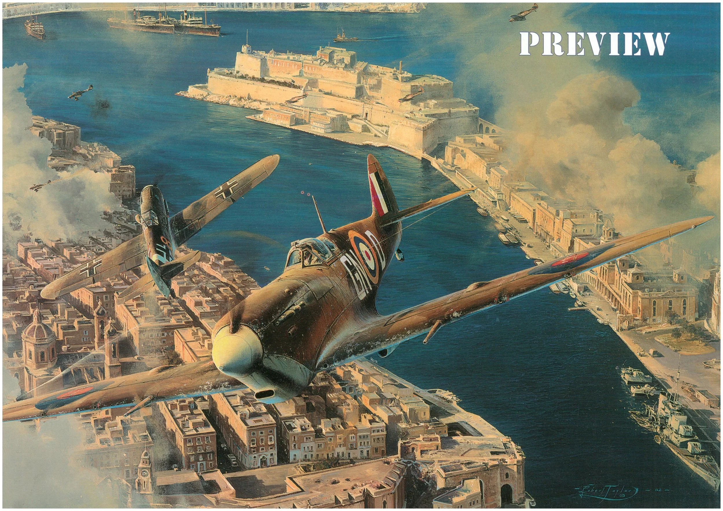 Pilot Officer John Bisley of 126 Squadron in combat with Me 109s from JG-53 during one of the intense aerial air battles over Valetta in April 1942. Between the summer of 1940 and the end of 1942, Malta became one of the most bombed places on earth. The RAF’s desperate fight to retain control of the diminutive Mediterranean island, and the defiant courage of the people of Malta, is one of the epic stories of World War Two.