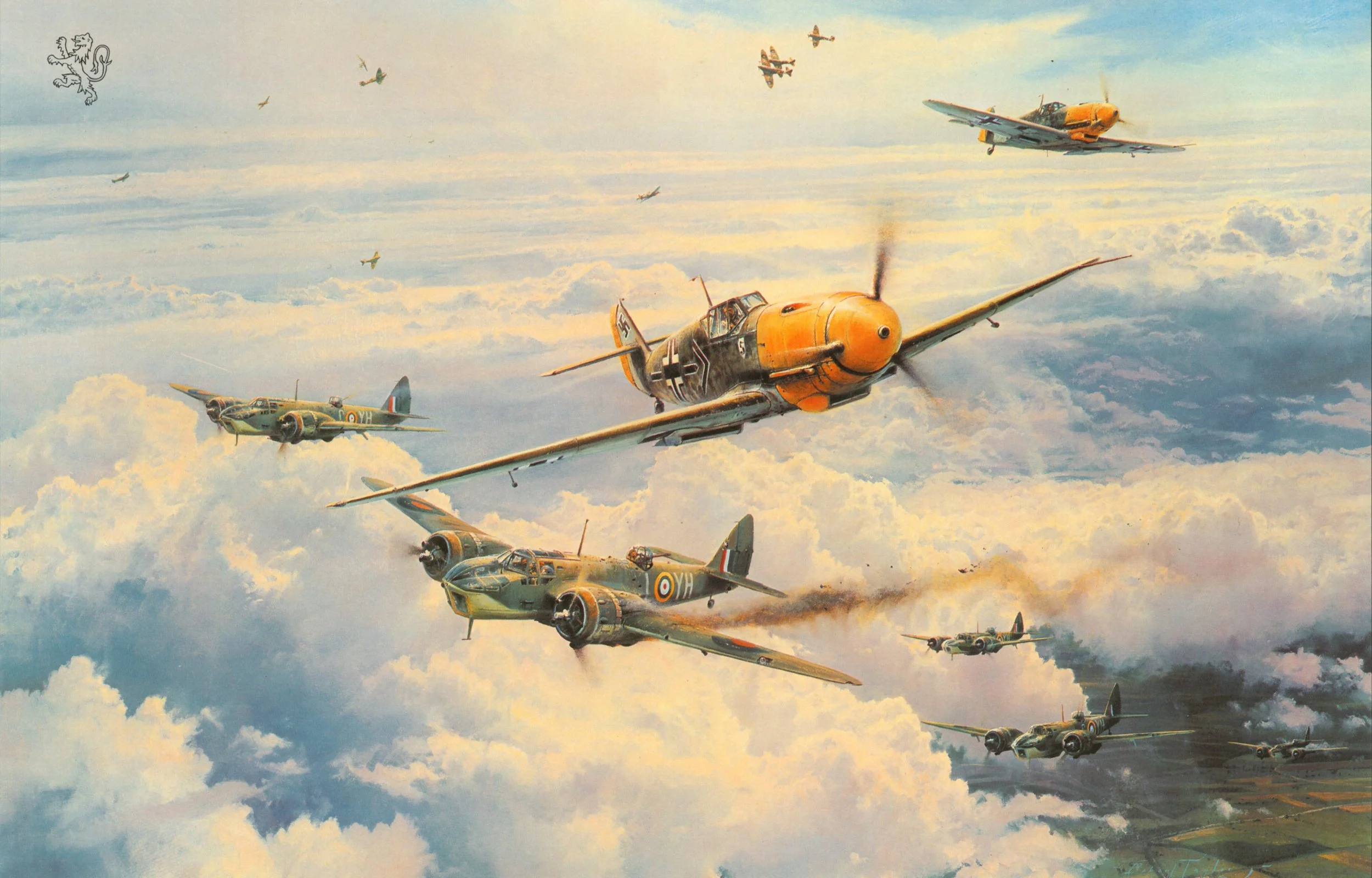 With his wingman Bruno Hegenauer, Galland powers his Me109 through the fighter escort to attack Blenheim bombers of No. 21 Squadron, raking the lead aircraft with cannon fire. In the background, a fierce dogfight is developing between the Me109s of JG-26 and Spitfires of 303 Squadron. Losses and victories will be high on both sides.