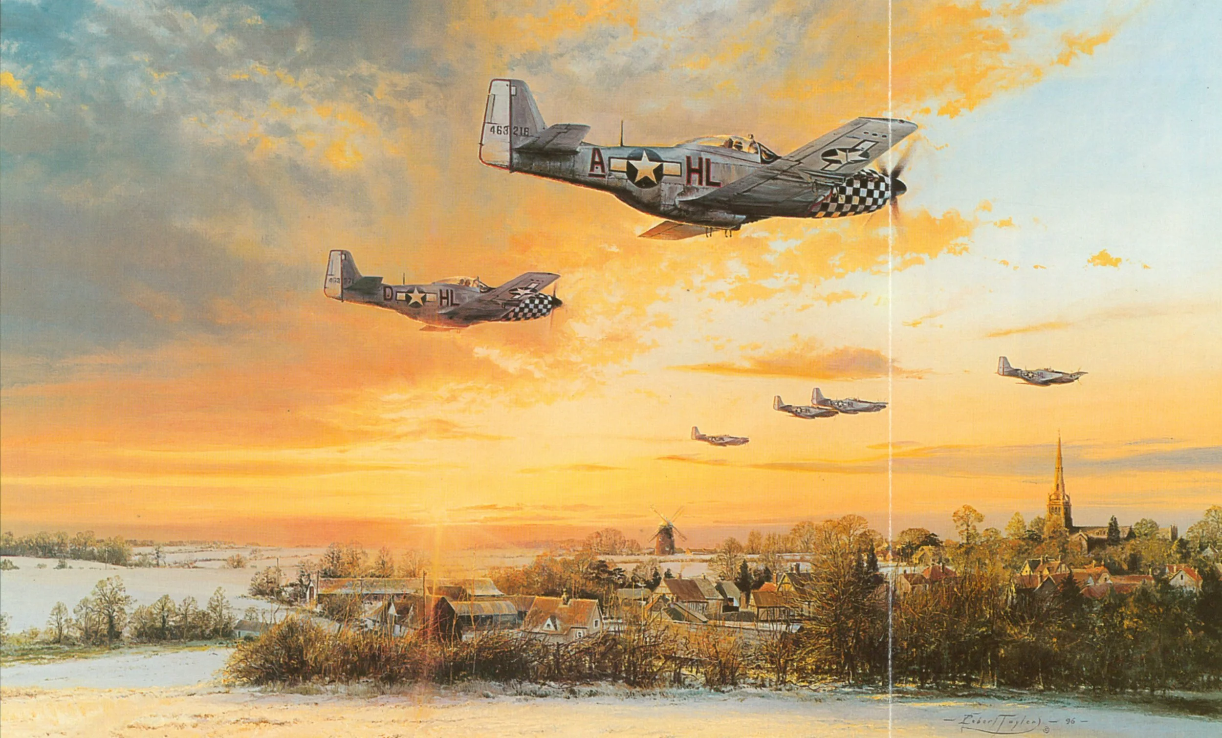 P-51D Mustangs of the 78th Fighter Group return to Duxford following an 8-hour escort mission during the cold winter of 1944-45.