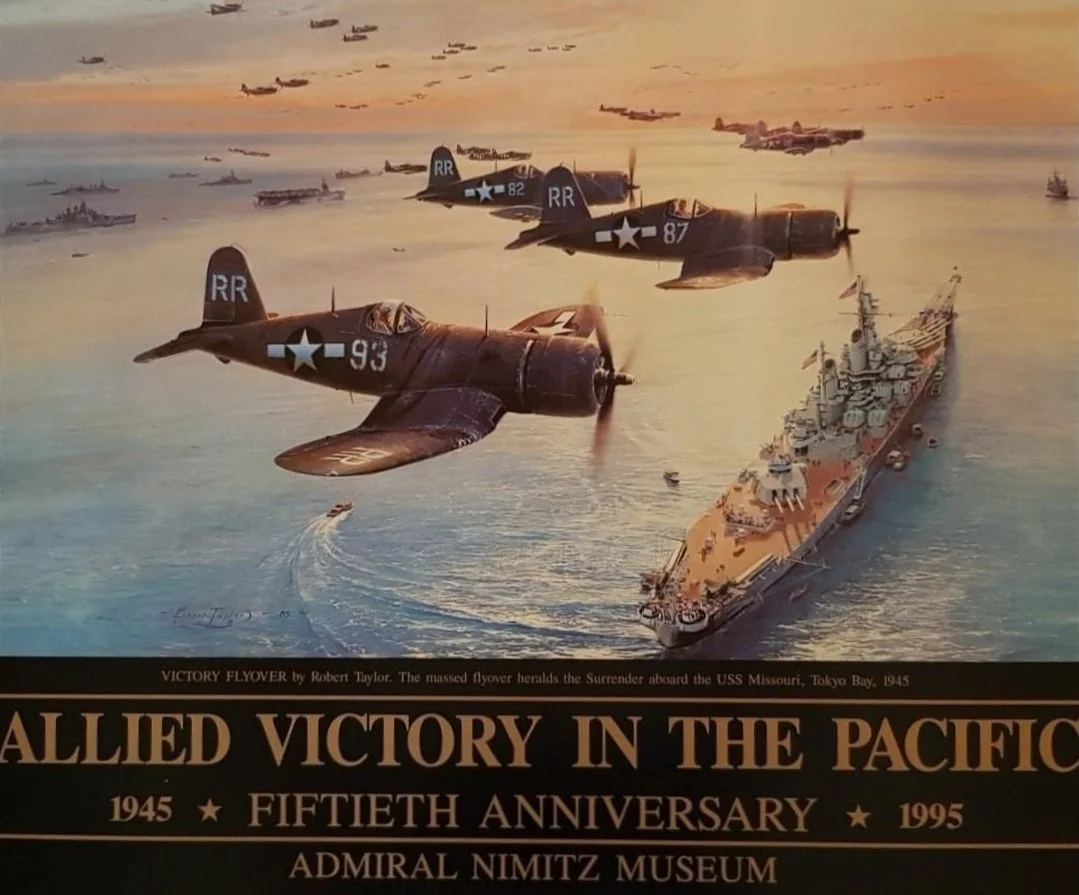Allied Victory in the Pacific. Commemorative poster to celebrate the 50th anniversary of the surrender ceremony of WWII in Tokyo Bay aboard the USS Missouri. A great Armada of American aircraft swept across Tokyo Bay as Corsairs, Hellcats, Avengers, Helldivers, Mustangs, Thunderbolts and Superfortresses, heralded in the peace.